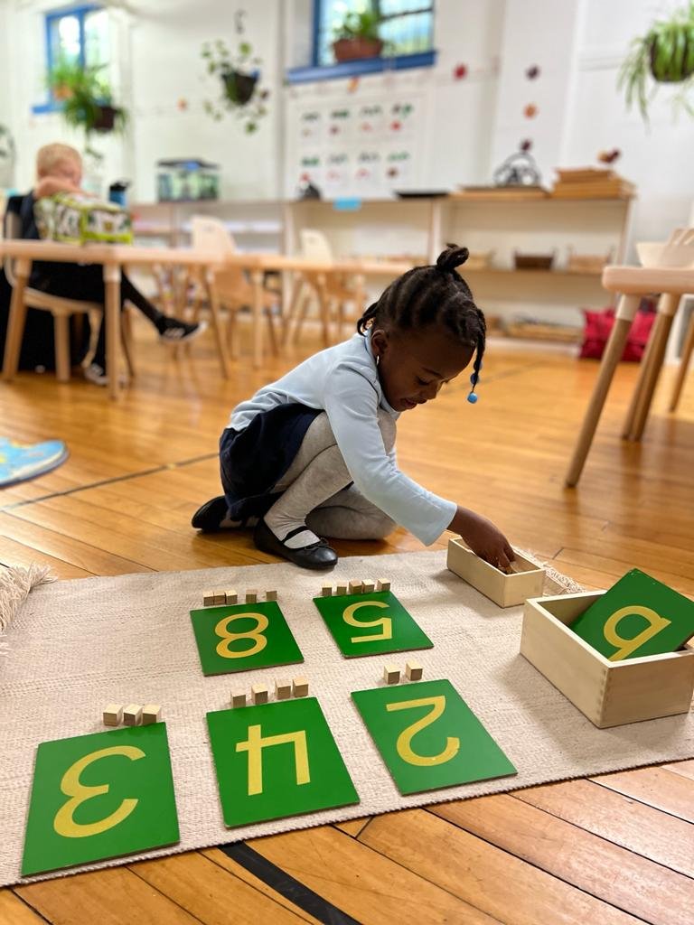 We use hands on materials to provide the child with a simple and clear understanding of the mathematical concepts being taught; examples are: number rods, sandpaper numbers, number boards, number beads, tiles and games. Each exercise builds upon another gradually guiding the child’s mathematical mind from the concrete into the more abstract areas of numeration.